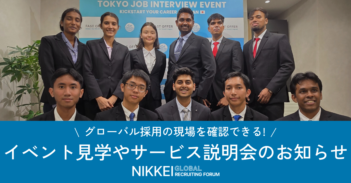 株式会社ASIA to JAPANは日本経済新聞社 人財・教育事業ユニットと共に、NIKKEI GLOBAL RECRUITING FORUMを開催します。人材獲得競争が年々激しさを増す中、優秀なグローバル人材を迎え入れ、共に成長していくことは日本企業の競争力を高める上で欠かせません。本フォーラムは、高度新卒外国人材と日本企業が直接出会い、互いの可能性を広げる場として、その第一歩を後押ししてまいります。