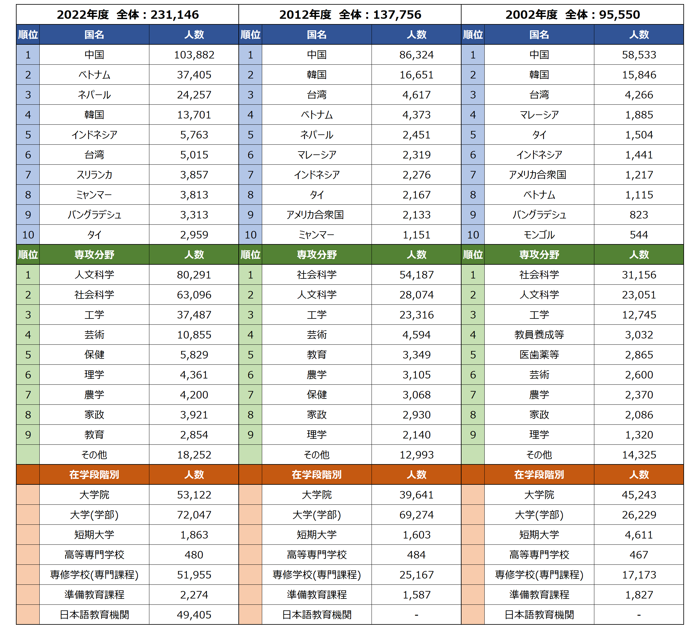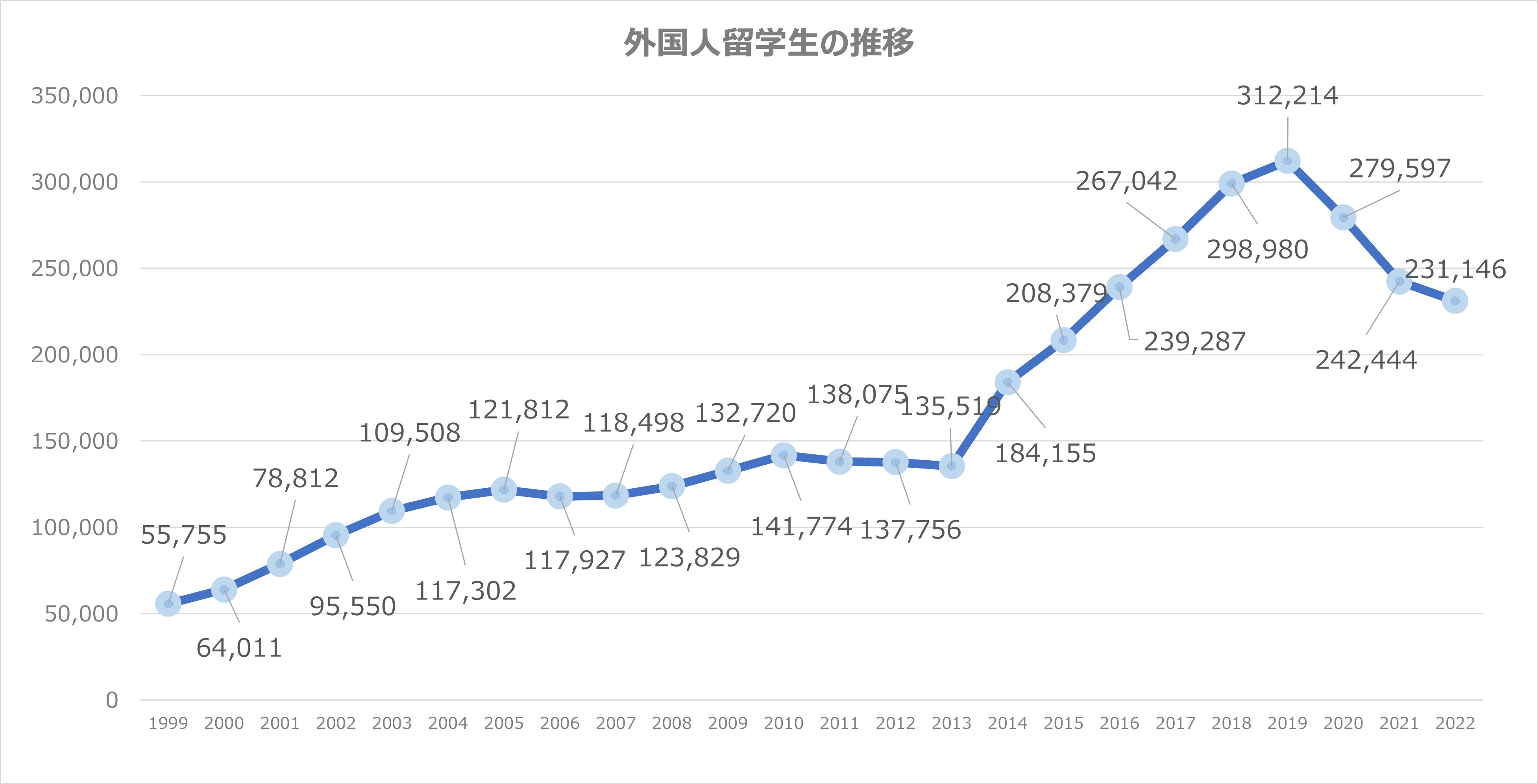 こちらも、JASSOの「外国人留学生在籍状況調査結果」をもとに、過去24年間の外国人留学生の推移を見てみましょう。 この表をみてわかるのが、コロナ禍においても日本人留学生に比べて、外国人留学生の人数が大幅に減少するということはありませんでした。