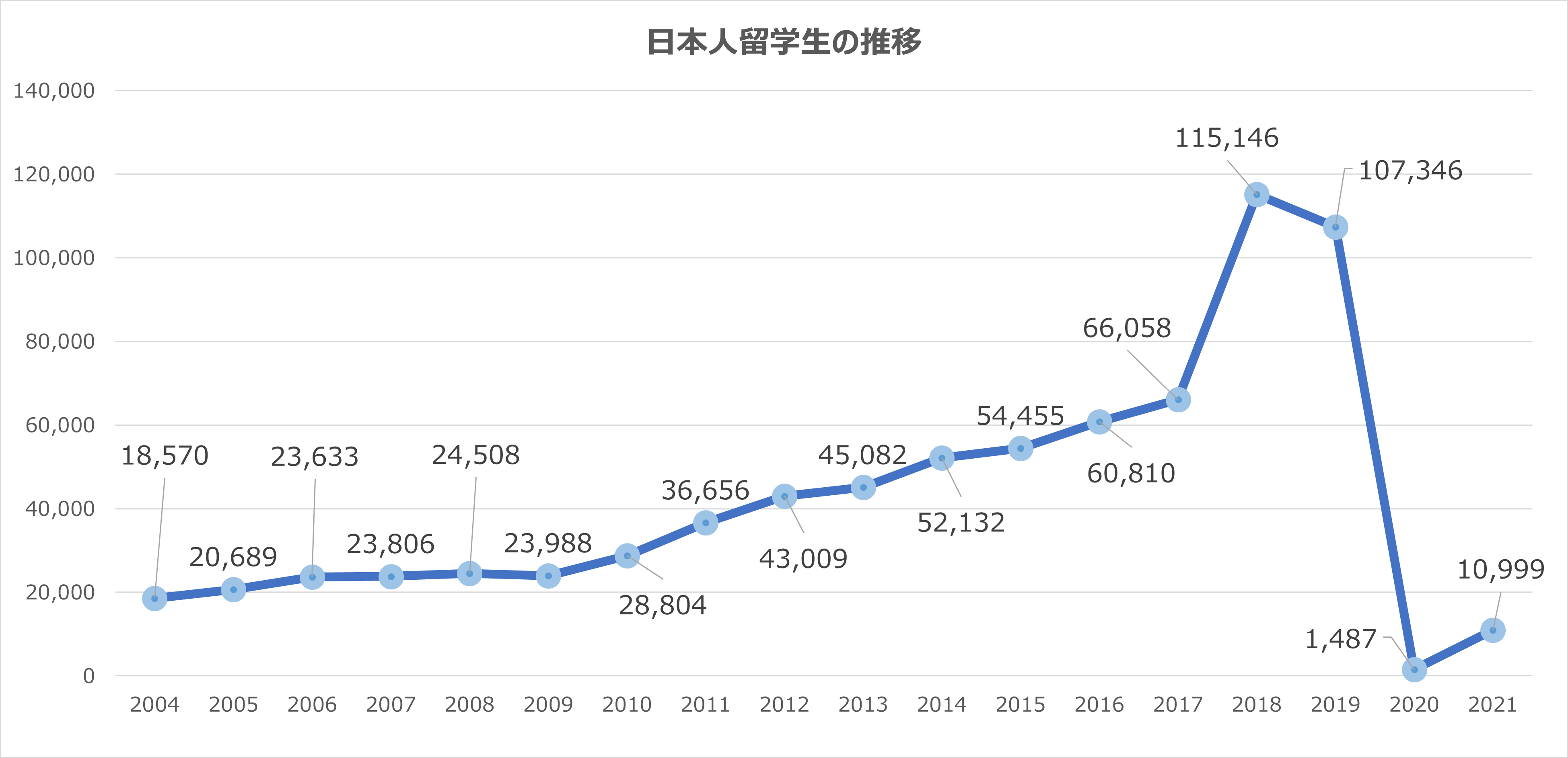2000年代初頭では、まだ海外で学ぶ選択を取る学生は2万人以下と少ない状況でした。 しかし、2018年になると前年の2倍近く急激に増加している事がわかります。