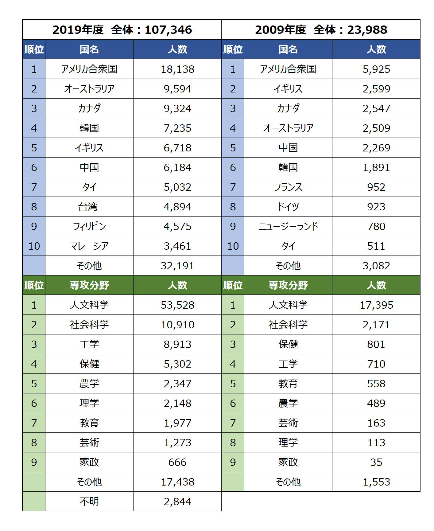 次に、日本人に人気がある留学先を、2019年度と10年前の2009年度とで比較して紹介します。 (コロナ禍以降は留学生数が少なく比較が難しいため、それ以前で比較します)