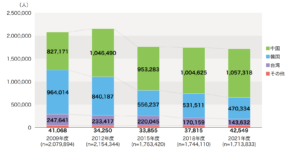 2021年度海外日本語教育機関調査によると、中国人の日本語学習者数は約105万人でした。地域別にみて100万人を超えている国は中国のみです。また、2018年度調査と比較し5.2%増加しており、下記のグラフからも、学習者数は増加傾向にあると言えるのではないでしょうか。