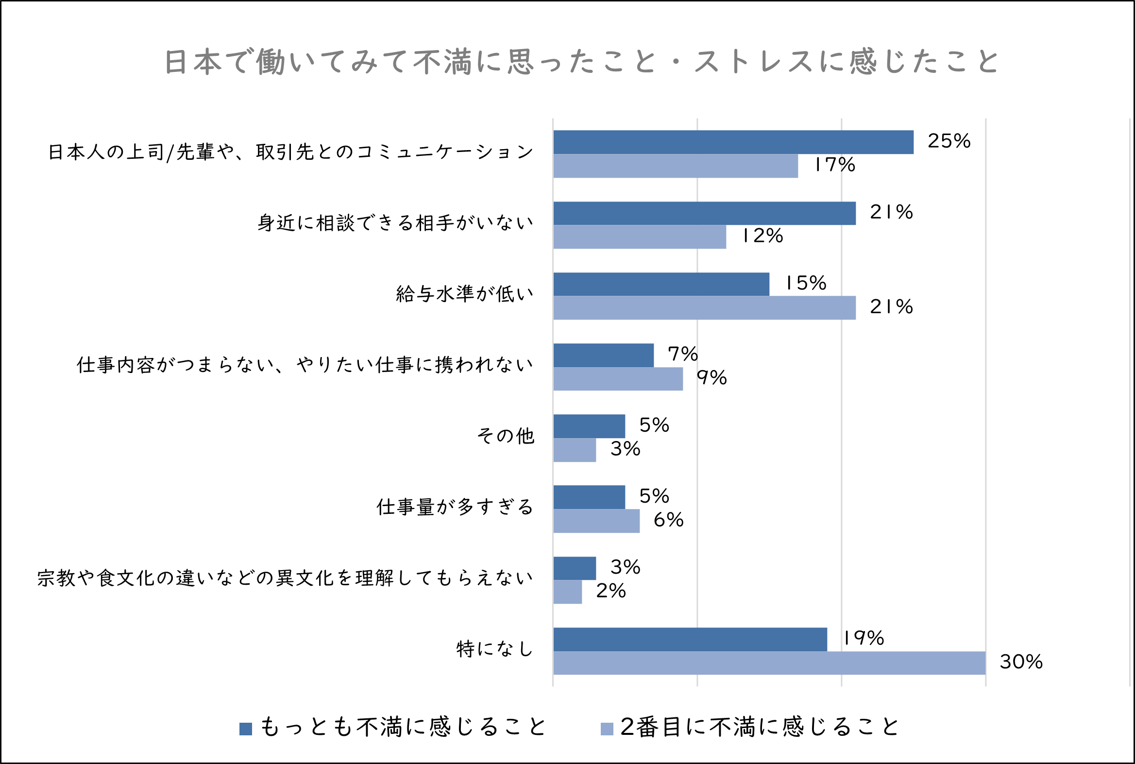 最も不満に感じていることは「日本人の上司や先輩、取引先とのコミュニケーション」(25%)で、「給与水準が低い」と回答したのは15%程度となりました。
