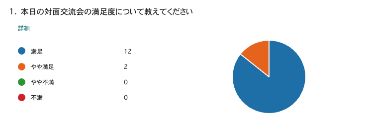 終了後に学生に対して行ったアンケートの満足度は100%。「新しい企業と出会えた」「たくさん話すことができた」といった声が目立ちます。