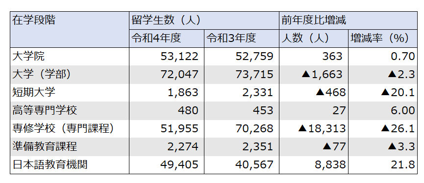 独立行政法人日本学生支援機構(JASSO)の「2022(令和4)年度外国人留学生在籍状況調査結果」によると、2022(令和4)年5月1日現在、日本における外国人留学生数は231,146人でした。内訳を在学段階や国・地域別に詳しく見ていきましょう。