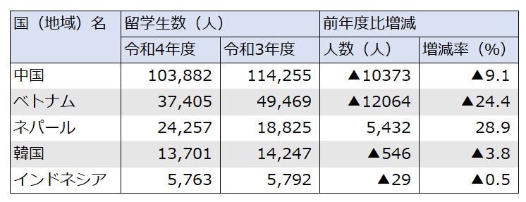 国・地域別の在籍数をみると、中国からの留学生が圧倒的に多いことがうかがえます。ベトナムが次いでランクインしていますが、両国とも前年度比より減少しています。一方で、3番目に多いネパールからの留学生数が前年度比28.9%増の24,257人と、増加していることが分かります。