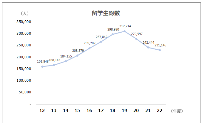2019年をピークに、外国人留学生数は減少しています。新型コロナウイルスの影響を受けたことが原因として考えられます。しかし、2022年3月以降、水際対策の緩和により、新規入国の留学生は増加に転じています。今後も増加の傾向が予想されるのではないでしょうか。