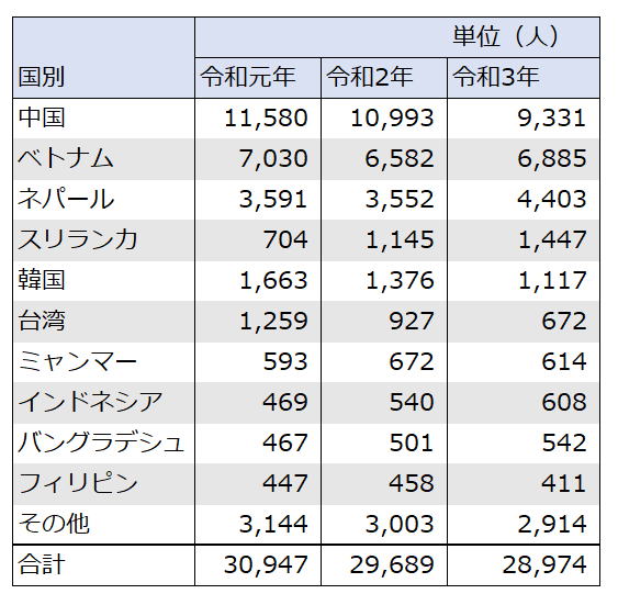 国籍別にみてみると、上位から中国9,331人、ベトナム6,885人、ネパール4,403人、スリランカ1,447人、韓国1,117人という結果になっています。留学生在籍数と上位三か国は同じですが、4位には在籍数のランキングには載っていないスリランカからの留学生がランクインしています。
