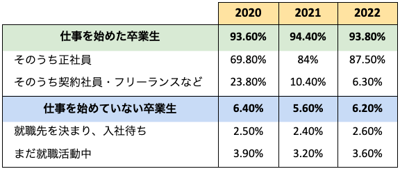 一方で、2022年に就職した人のうち、87.5%が正社員として雇用されています。こちらは前年の84%から3.5%上昇しました。細かく見てみるとフリーランスの割合は、前年比較で0.1%微増、パートタイムまたは臨時雇用の割合は、4.2%減少しています。