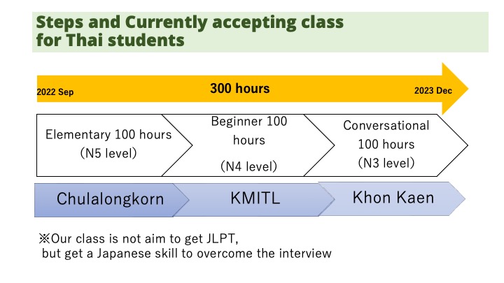 タイで開催している日本語学習プログラムは、合計300時間に及びます。この日本語クラスでは日本語能力試験(JLPT)合格ではなく、日本の就職面接に対応するための独自カリキュラムを提供しています。