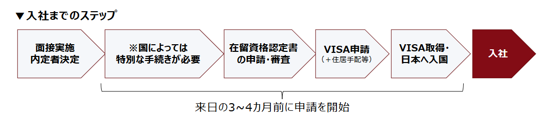 以下の通り、国内の学生採用とは異なり海外大生の入社までには必要書類の申請などのステップが発生します。