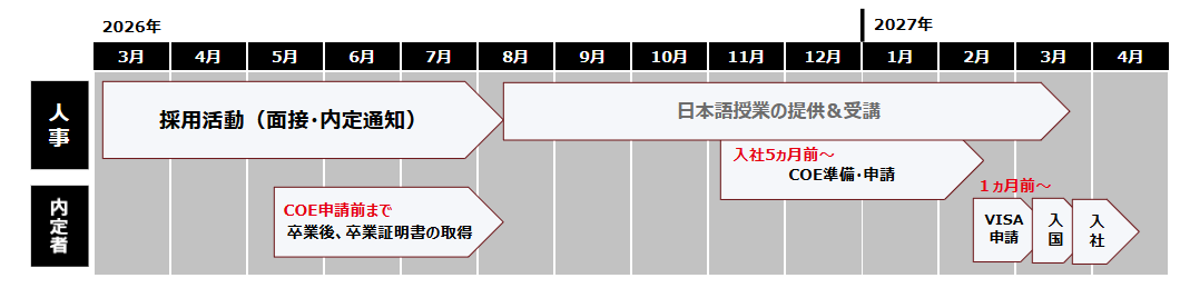 2026年5月頃まで:国内のインターンシップ設計と同時並行で、外国籍社員を採用する際の手法や要件について等を整理