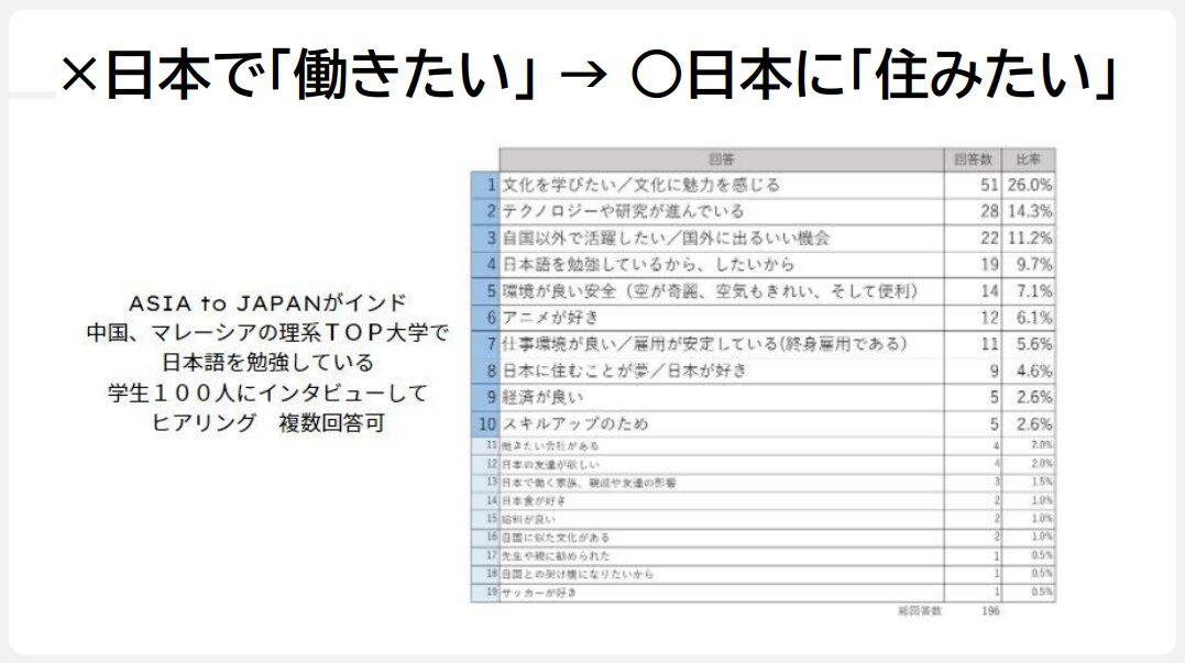 もう一つ、日本の大きなアドバンテージは「日本に住みたい」外国人材がたくさんいる点です。日本での就業を希望している外国人材の多くは「日本に住みたい」が起点であり、そのために就業を希望するという順番です。これは年収額で外国人材を呼び込めない日本にとって大きな武器。便利で物価は安く、安心安全ということで、就職後に日本から母国へ帰る人も少数です。