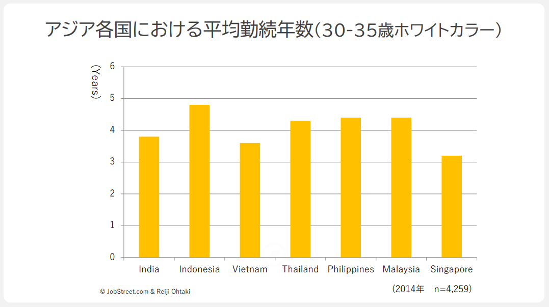 まずインド、インドネシア、ベトナム、タイ、フィリピン、マレーシア、シンガポールの30〜35歳、大卒以上のホワイトカラーの平均勤続年数は3〜4年です。2014年のデータなので少し古いですが、今も傾向はあまり変わらないと思います。