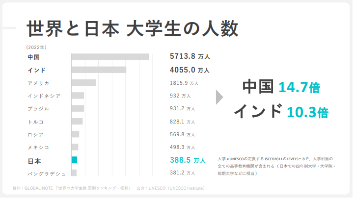 一方、世界を見ると、日本の大学生は約390万人なのに対し、インドは約4050万人、中国は約5700万人という驚異的な数です。つまり日本の大学生は減っているけれど、世界に目を転じれば大学生はたくさんいる。