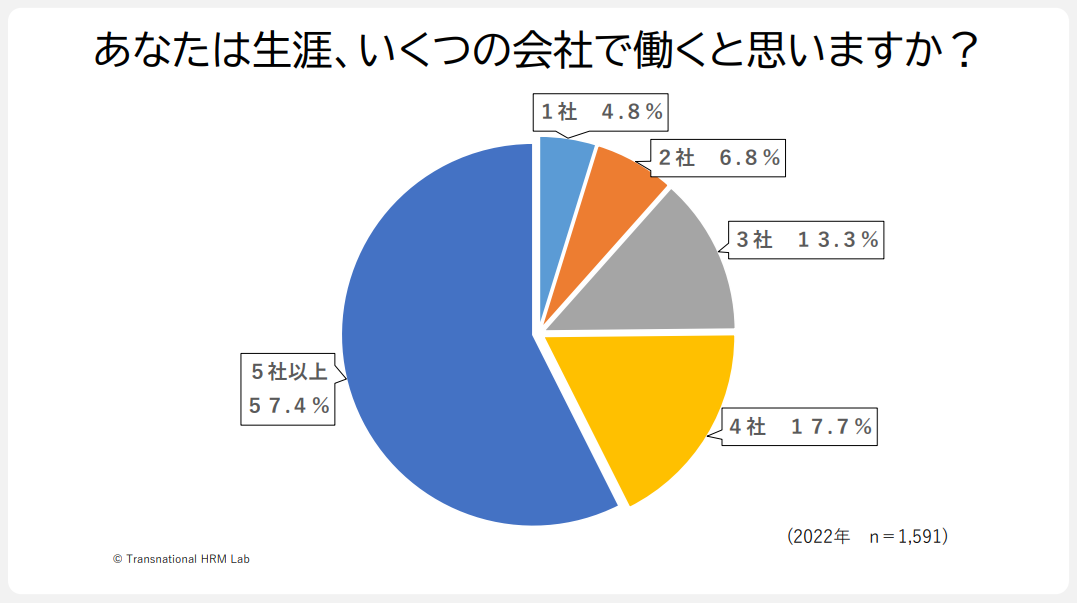 「あなたは生涯、何社で働くと思いますか?」という質問に対しては、約6割が「5社以上」と答えています。ただ、「もしあなたが生涯1社で十分なキャリアを築けるとしたら、そのキャリアを選びますか?」という質問に対して「はい」と答えた人は44%です。
