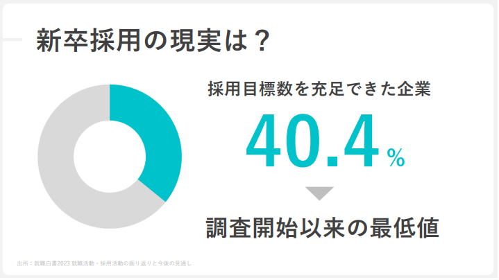 三瓶:調査レポート「就職白書2023」によると、2023年卒採用で目標数を充足できた企業は40%。これは過去最低の数値です。