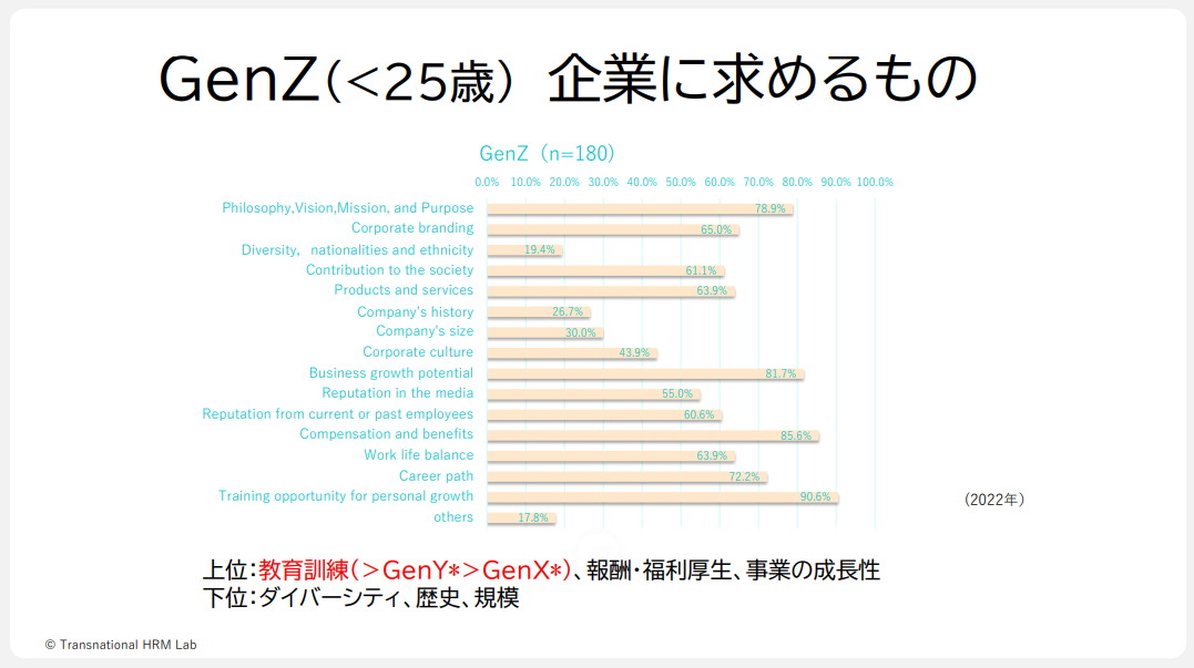 2022年に行った調査では、Z世代が企業に求めるものは「教育訓練の機会」でした。これはミレニアル世代やX世代と比べても顕著な傾向です。