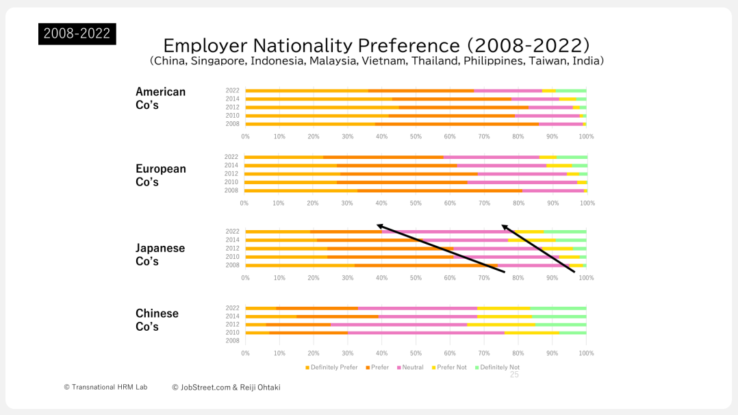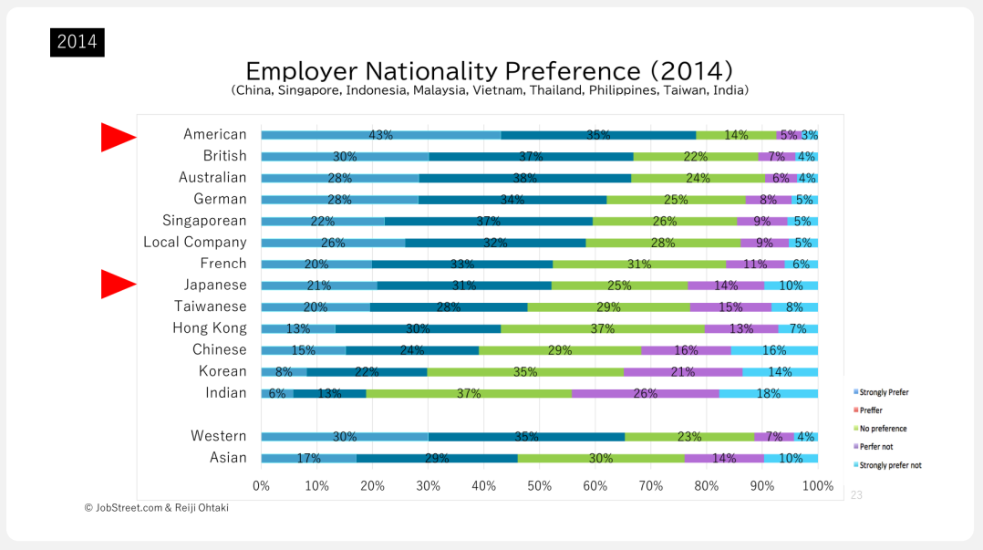 大滝:次に、アジアのホワイトカラーが日本企業をどう見ているのか、2014年と2022年の調査結果から見ていきましょう。まず、2014年の人気ナンバーワンはアメリカ企業です。オファーがあったら受けると答えた人は8割にのぼります