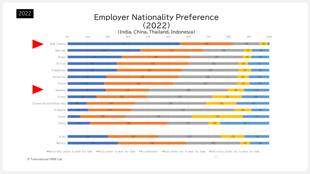 一方、2022年の調査では、母国の企業が一番人気です。2010年代にアジアが経済成長した結果、母国の企業の人気が高まっていると考えられます。