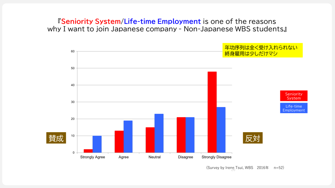 最後に、早稲田大学ビジネススクールの学生が行った調査をご紹介します。日本企業の年功序列と終身雇用制度について外国人材に聞いた調査で、以下のグラフは赤が年功序列、青は終身雇用を表します。