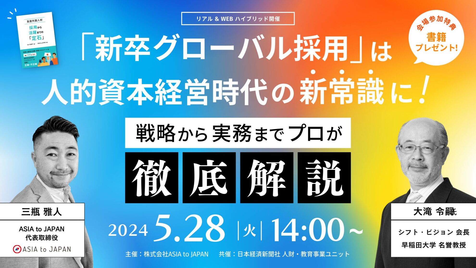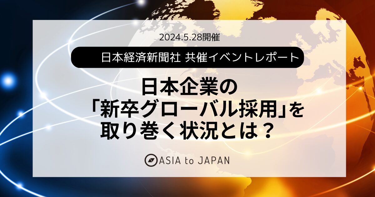 24年5月28日、ASIAtoJAPANと日本経済新聞社の共催イベント『「新卒グローバル採用」は人的資本経営時代の新常識に!戦略から実務までプロが徹底解説』を行いました。労働力確保のみならず、ダイバーシティの促進やイノベーション創出など、さまざまな効果が期待できる新卒の高度外国人材採用。