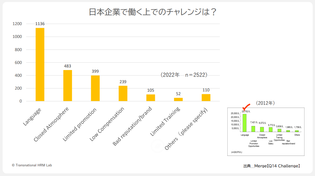 そして「日本企業で働くとしたら何がチャレンジですか?」という質問への回答は、圧倒的に「日本語」です。先ほど三瓶さんが日本語要件を撤廃すれば素晴らしい人材にアクセスできるとおっしゃっていたことの裏付けとなる結果だと思います。