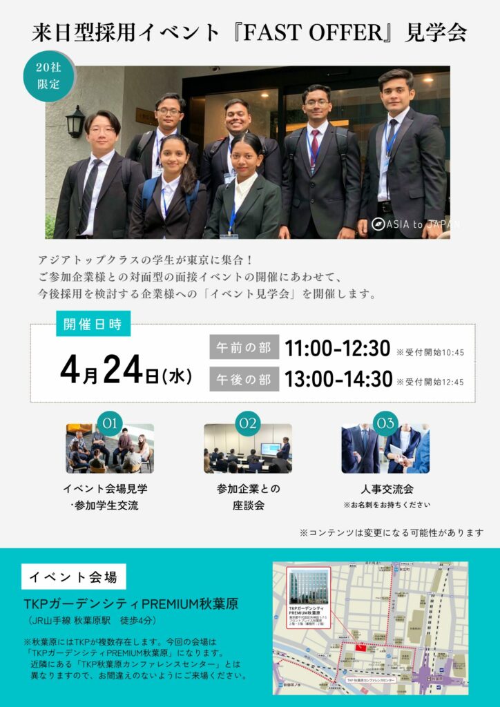 2024.02.06 イベント フィーチャー 【見学会お申し込み】2024年4月24日開催|来日型面接会 記事をシェアする 目次 <まずはイベント見学してみたい!企業様向け> 4月24日開催『FAST OFFER』見学会お申込みフォーム このフォームに入力するには、ブラウザーで JavaScript を有効にしてください。参加ご希望の回 *午前の部(11:00-12:30)午後の部(13:00-14:30)参加人数 ※1社につき2名様までご参加可能です *会社・組織名 **同業者の方、転職希望者の方のご参加はご遠慮いただいております氏名 *役職/ご担当 *会社メールアドレス **フリーアドレスのご登録はご遠慮いただいております。法人メールアドレスをご入力ください。お電話番号 ※当日ご連絡がとれるお電話番号をご入力ください。 *見学会で知りたいこと(複数選択可) * FAST OFFER(面接会)が、どのようなサービスか確認したい 他社がどのような面接を実施しているかについて 海外学生が自社に興味を持ってくれるかについて 海外学生の日本に関する興味・関心度合について 外国人受け入れ時の注意点について 申し込む 前のコラム 次のコラム 関連したコラム 2026.03.18 アーカイブ配信【ウェビナー】高度外国人40万人時代 外国籍社員の早期戦力化に向けた“定着・活躍”設計とは アーカイブ動画視聴可能 2025.09.04 アーカイブ配信【ウェビナー】新常識!施工管理の外国籍採用|もう採用に困らない アーカイブ動画視聴可能 2025.09.04 アーカイブ配信【ウェビナー】インド工科大学(IIT)基礎セミナー アーカイブ動画視聴可能