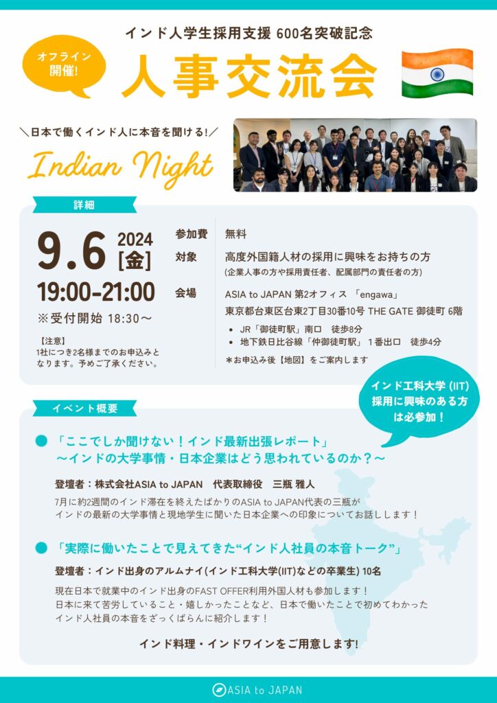 2024.08.06 イベント フィーチャー 【イベントお申し込み】2024年9月6日開催|人事交流会 ” Indian Night “ 記事をシェアする 目次 ご好評につきお申し込みを締め切らせていただきました。 前のコラム 次のコラム 関連したコラム 2026.03.18 アーカイブ配信【ウェビナー】高度外国人40万人時代 外国籍社員の早期戦力化に向けた“定着・活躍”設計とは アーカイブ動画視聴可能 2025.09.04 アーカイブ配信【ウェビナー】新常識!施工管理の外国籍採用|もう採用に困らない アーカイブ動画視聴可能 2025.09.04 アーカイブ配信【ウェビナー】インド工科大学(IIT)基礎セミナー アーカイブ動画視聴可能