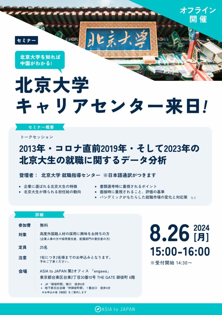 2024.08.08 イベント フィーチャー 【イベントお申し込み】2024年8月26日開催|北京大学・就職指導センター来日セミナー 記事をシェアする ※本セミナーの受付は終了いたしました。 前のコラム 次のコラム 関連したコラム 2026.03.18 アーカイブ配信【ウェビナー】高度外国人40万人時代 外国籍社員の早期戦力化に向けた“定着・活躍”設計とは アーカイブ動画視聴可能 2025.09.04 アーカイブ配信【ウェビナー】新常識!施工管理の外国籍採用|もう採用に困らない アーカイブ動画視聴可能 2025.09.04 アーカイブ配信【ウェビナー】インド工科大学(IIT)基礎セミナー アーカイブ動画視聴可能