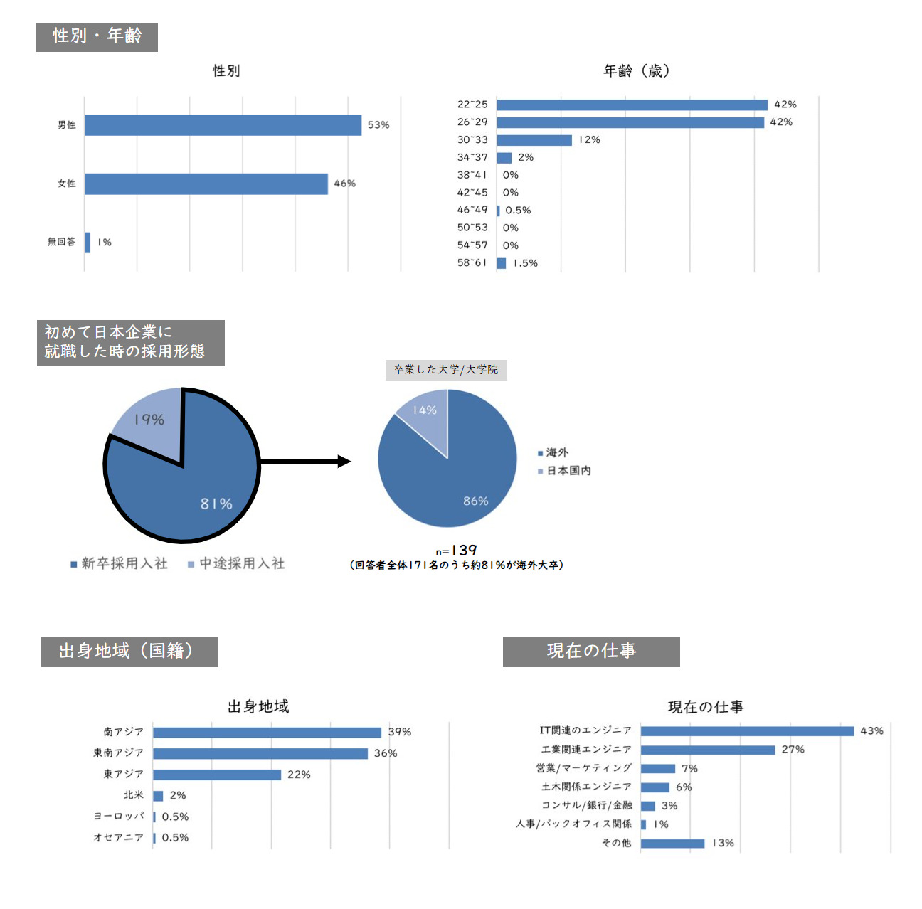 回答者の男女比はおよそ半々、年代は約8割が20代で、全体の9割弱が海外の大学を卒業。新卒で日本企業に入社した人の割合は約8割となっています。