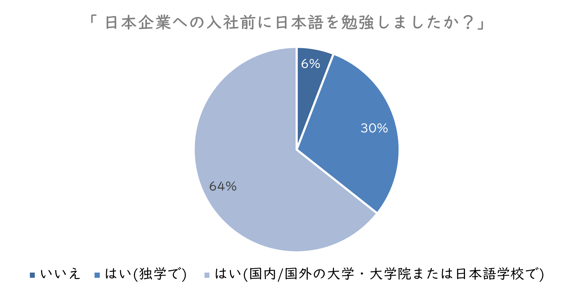 まずアンケート回答者のうち、日本企業に入社する前に日本語を勉強した人の割合は、国内外の大学・大学院または日本語学校で学んだ人が64%、独学で学習した人が30%と、合計で94%。ほとんどの人が入社前から日本語学習を開始しています。