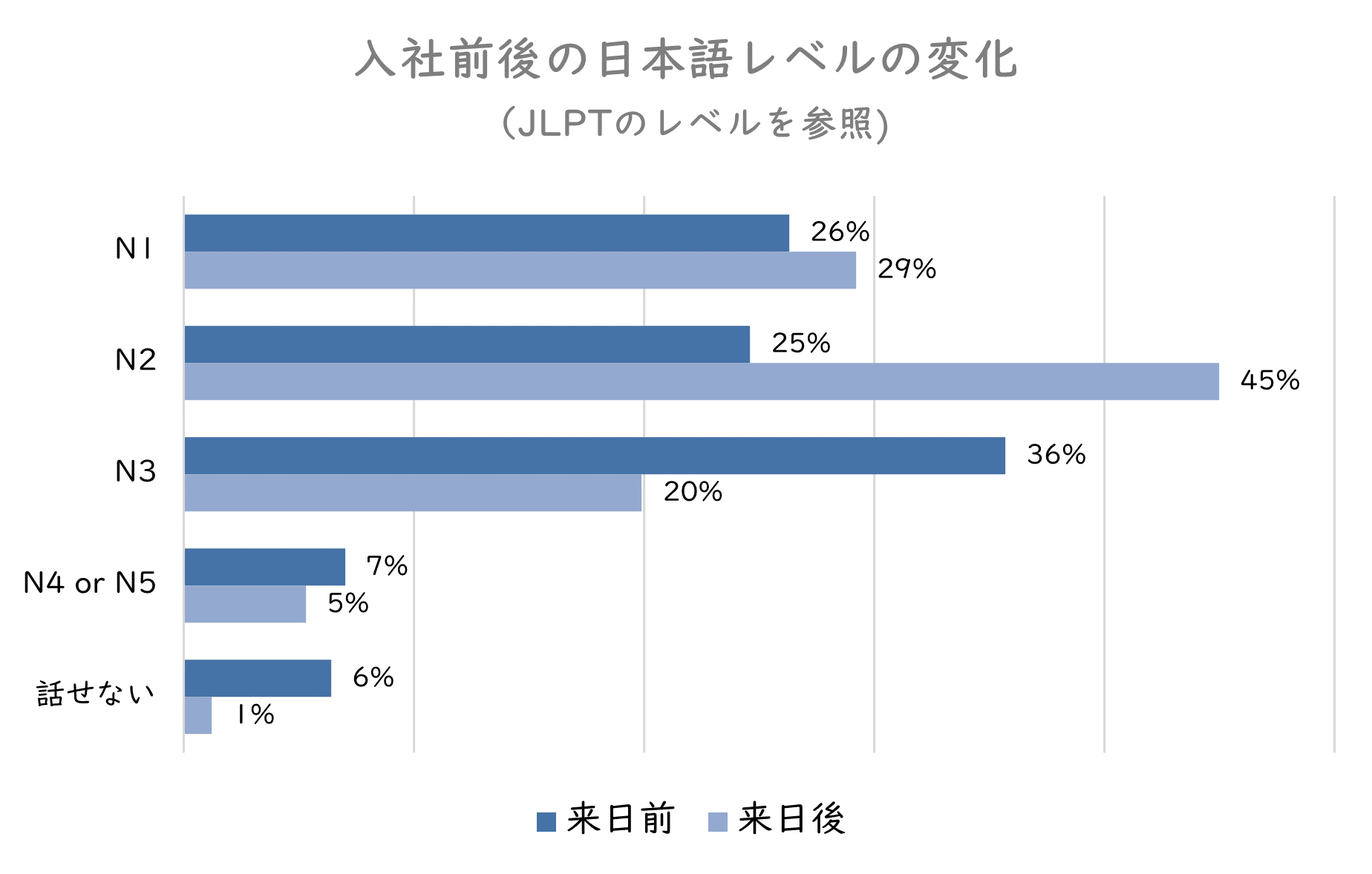 外国人材の日本語レベルは、来日前はN3が35.7%と最も多いですが、来日後はN2が45%と、来日前のN2の割合の倍近くまで増えています。来日後に日本で生活する中で日本語力が伸びるのはもちろんですが、日本企業との面接時に目指すべきレベルがN3、入社までに目指すレベルがN2という、それぞれのフェーズで目安とされているレベルに準じた結果と考えられます。