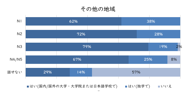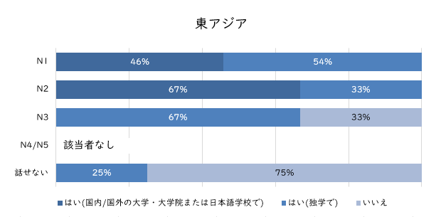 以下は「日本企業に入社する前に日本語を勉強したか」という質問の結果を東アジア(中国、台湾、香港、韓国、モンゴル)とそれ以外の地域に分けて集計したグラフですが、その他の地域ではN1〜N5の全てのレベルにおいて学校で日本語学んだ人の割合が6〜8割になるのに対し、東アジアではN3取得者のうち学校で日本語を学んだ人はゼロという結果になっています。