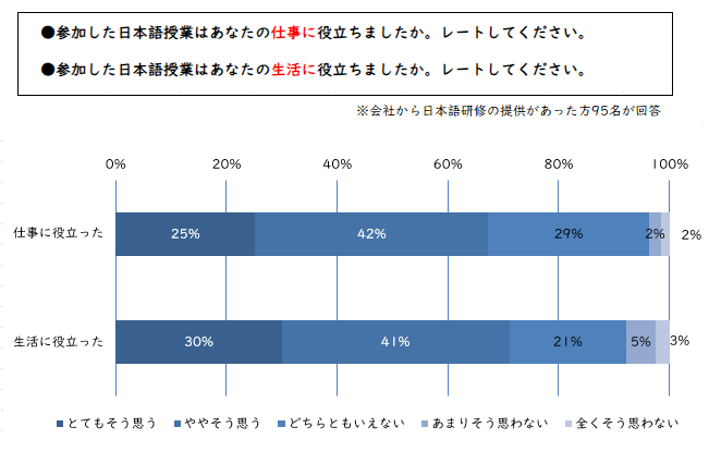 外国人材の入社後、日本人と仕事をする中で日本語レベルは上がっていくとはいえ、日本語を学ぶ機会を提供するのは重要です。アンケートによると半数以上が「企業から日本語学習の機会を与えられている」と回答しており、その約7割が「仕事および生活に役に立った」と評価しています。