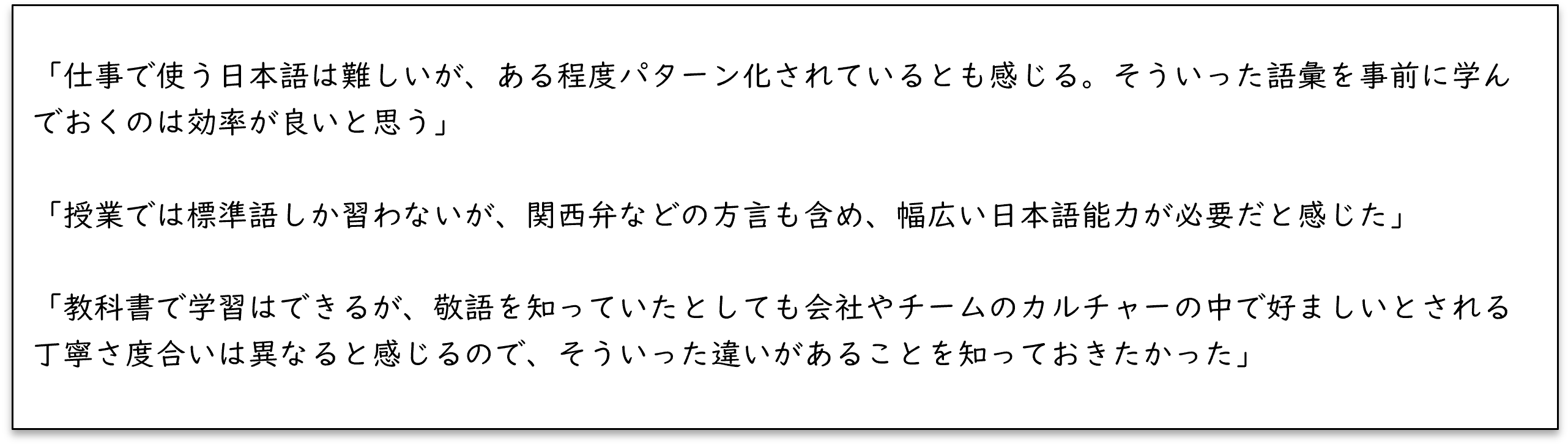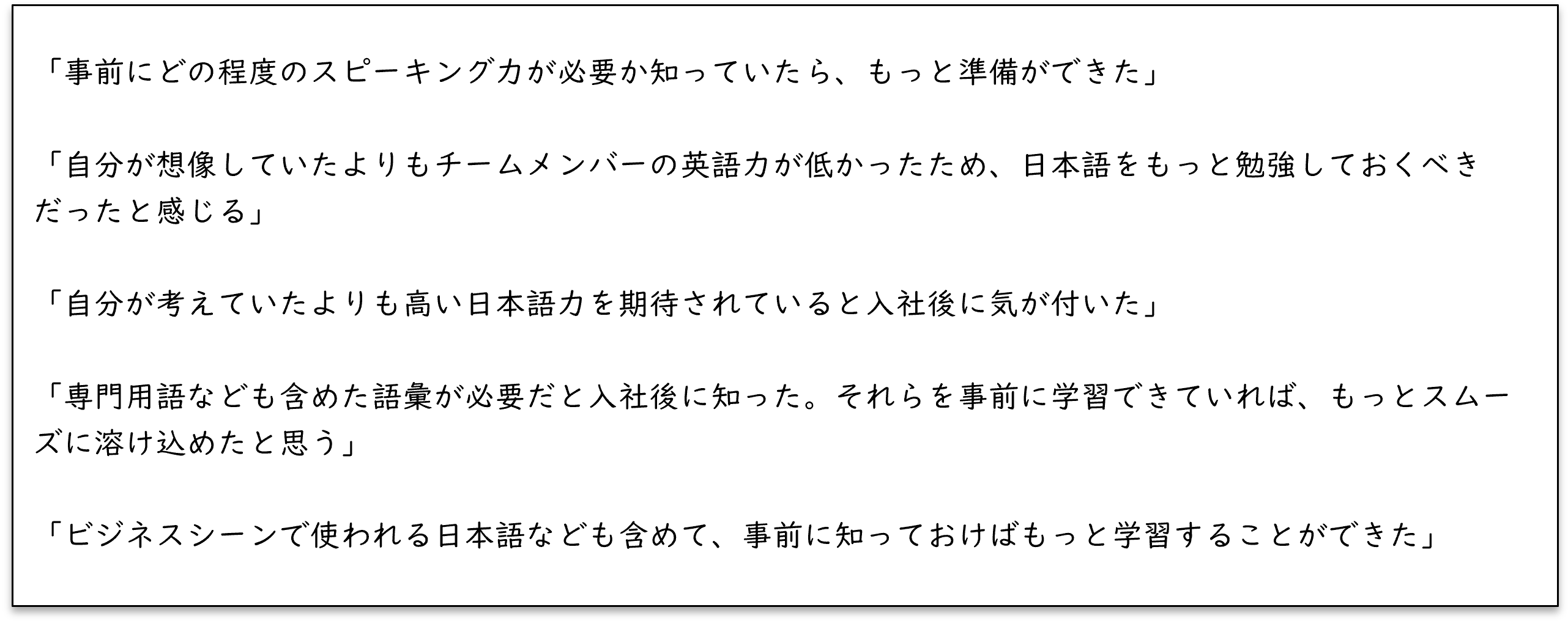 また、「事前に求められる日本語レベルを知っておきたかった」というニーズも多く寄せられました。外国人材にとっても、必要とされる日本語力を踏まえた上で、そこに向けて準備をしたい思いがあるのです。