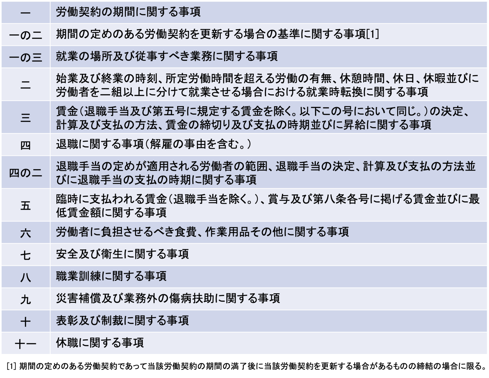 明示を必要とする労働条件は労基則5条1項各号に定められていますので紹介します。