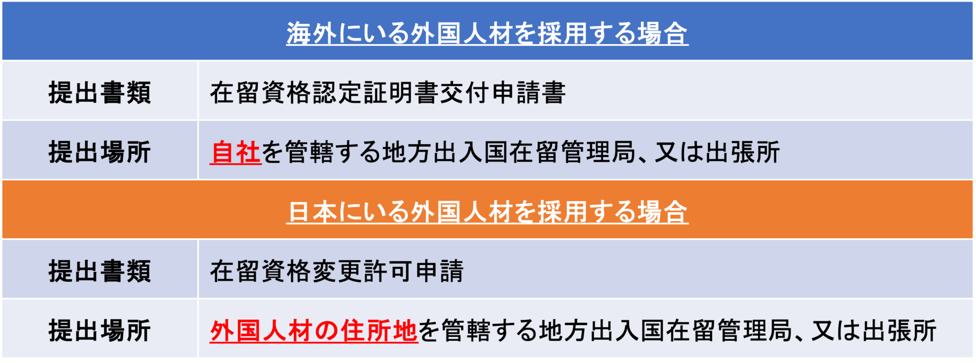 外国人材を採用する際、その人材が「国内」にいるかどうかで、手続き方法が変わるので注意が必要です。
