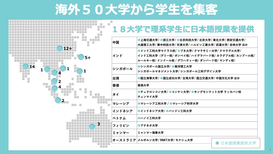 このギャップを解消するため、ASIA to JAPANは日本就職を目指す海外大学の学生に日本語研修プログラムを提供しています。
