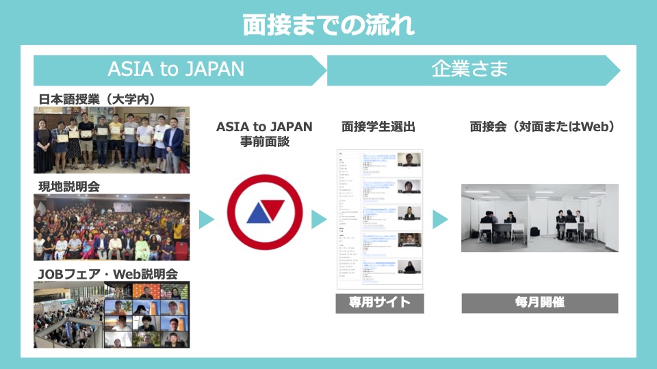 面接までに必要な次の工程を、企業様に代わってASIA to JAPANが対応します。